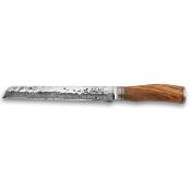 Enfin, le manche est fabriqué en bois d'olivier, qui a été poncé puis traité pour être plus résistant. L'olivier est un bois noble, dont l'odeur fruitée est très agréable. Son toucher est également appréciable, sa surface douce et sa forme unique se calent parfaitement dans la main. Les veines sont uniques sur chaque couteau, pour encore plus de cachet.