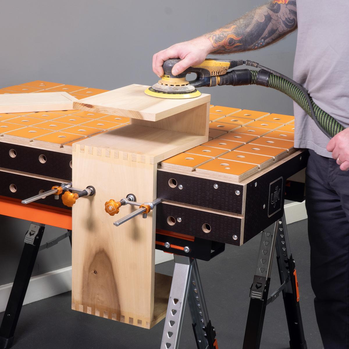 • Un tréteau solide et réglable en hauteur pour des configurations d’établi flexibles
