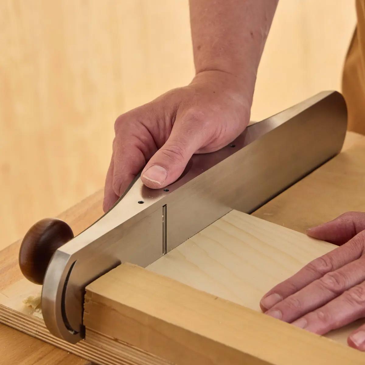 Ce rabot sert à recaler des onglets, à travailler le bois de bout, à dresser des chants et à amorcer les rabotages de finition. Il se distingue par son format et son poids généreux, son centre de gravité bas et l’emplacement de la lumière sur la semelle. Son fer dont le biseau est orienté vers le haut repose sur un lit incliné à 12°, semblable à celui d’un rabot de coupe à angle faible.